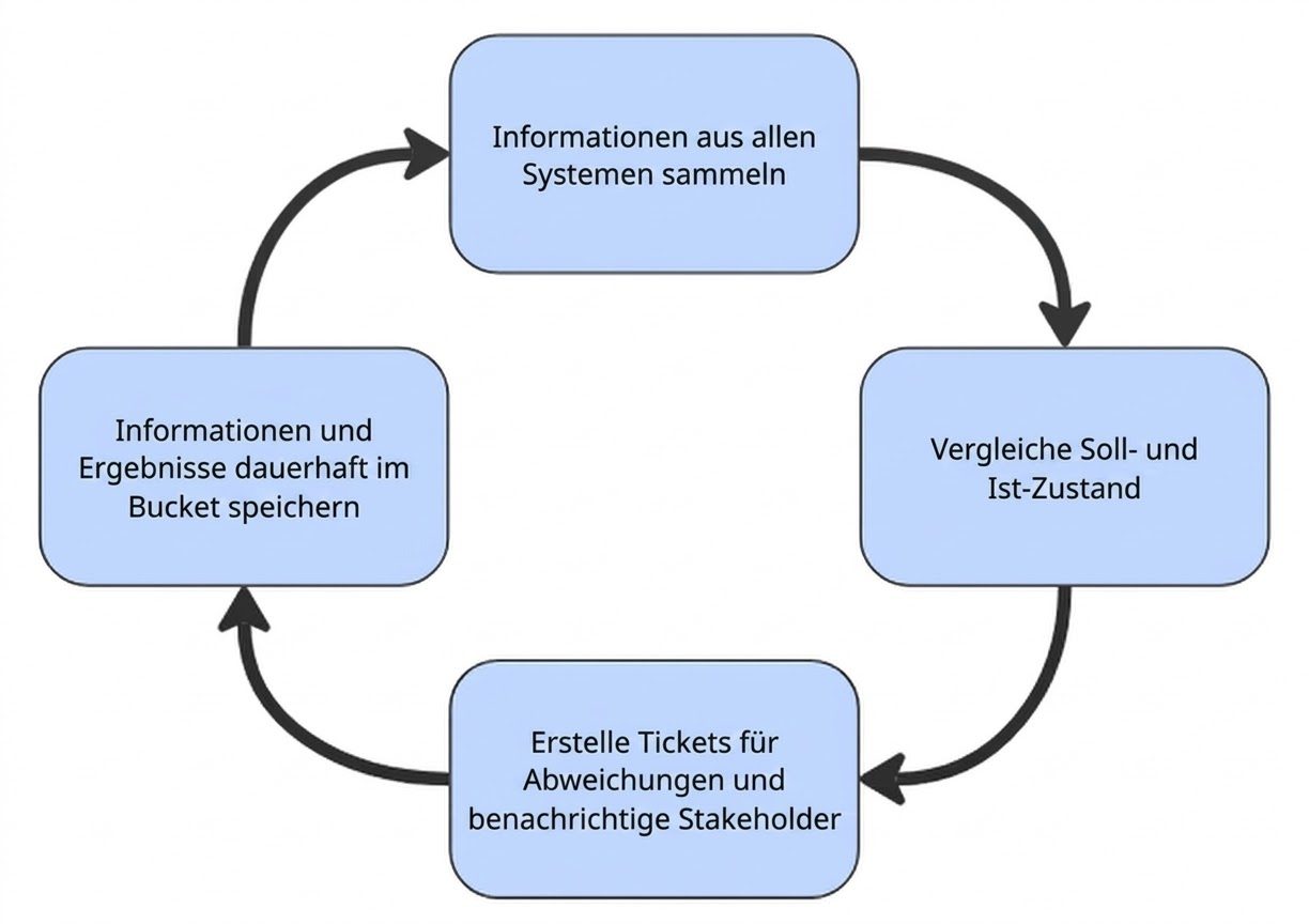 Gemäs Anhang A.5.18 der ISO 27001:2022-Zertifizierung sind wir verpflichtet, die in all unseren Systemen erteilten Zugriffsrechte regelmässig zu überprüfen. Wie oben erwähnt, wollten wir uns bei wiederkehrenden Aufgaben wie der Validierung der Zugriffsrechte nicht auf manuelle Prozesse verlassen, daher haben wir den gesamten Prozess automatisiert. Ein weiterer Vorteil davon ist, dass wir die Zugriffskontrollen bei Bedarf nahezu dauerhaft ohne personellen Aufwand durchführen können.