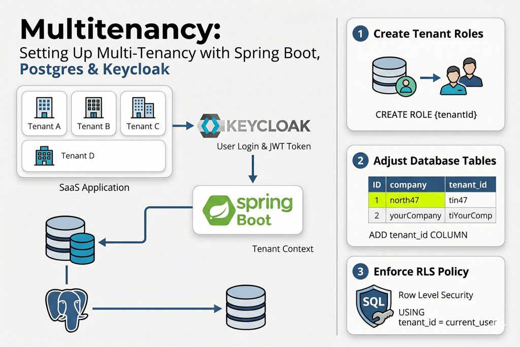 There are several ways to implement this, and the approach you choose has lasting consequences for your security model, infrastructure complexity, and scalability. In this post, we walk through our preferred approach: a shared database with Row Level Security (RLS) enforced directly by PostgreSQL, wired into a Spring Boot application with Keycloak handling authentication.